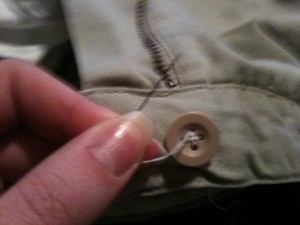Mending is the last thing on my radar of things I need to do. My husband has even gone so far as asking my mother to hem an undone pant leg for him which she happily did because I always put it on the back burner. Last week the Hubs asked me to sew a couple of buttons on two pairs of khakis- I told him I’d put it on my list. And since it’s on my list, it became a priority- not a top priority, mind you, but I wanted to get it marked off so I made it a 10 minute challenge. Think I can sew two buttons in 10 minutes? You bet! Threading the needle is another story though- it took me 10 minutes just to realize that there was a needle threader in my little kit which made it quite easy! This was one of those little tasks I just dread for some reason. I’m happy I had something to cross off- an accomplishment- yay! And the Hubs is happy to have two pairs of pants added back into his wardrobe.