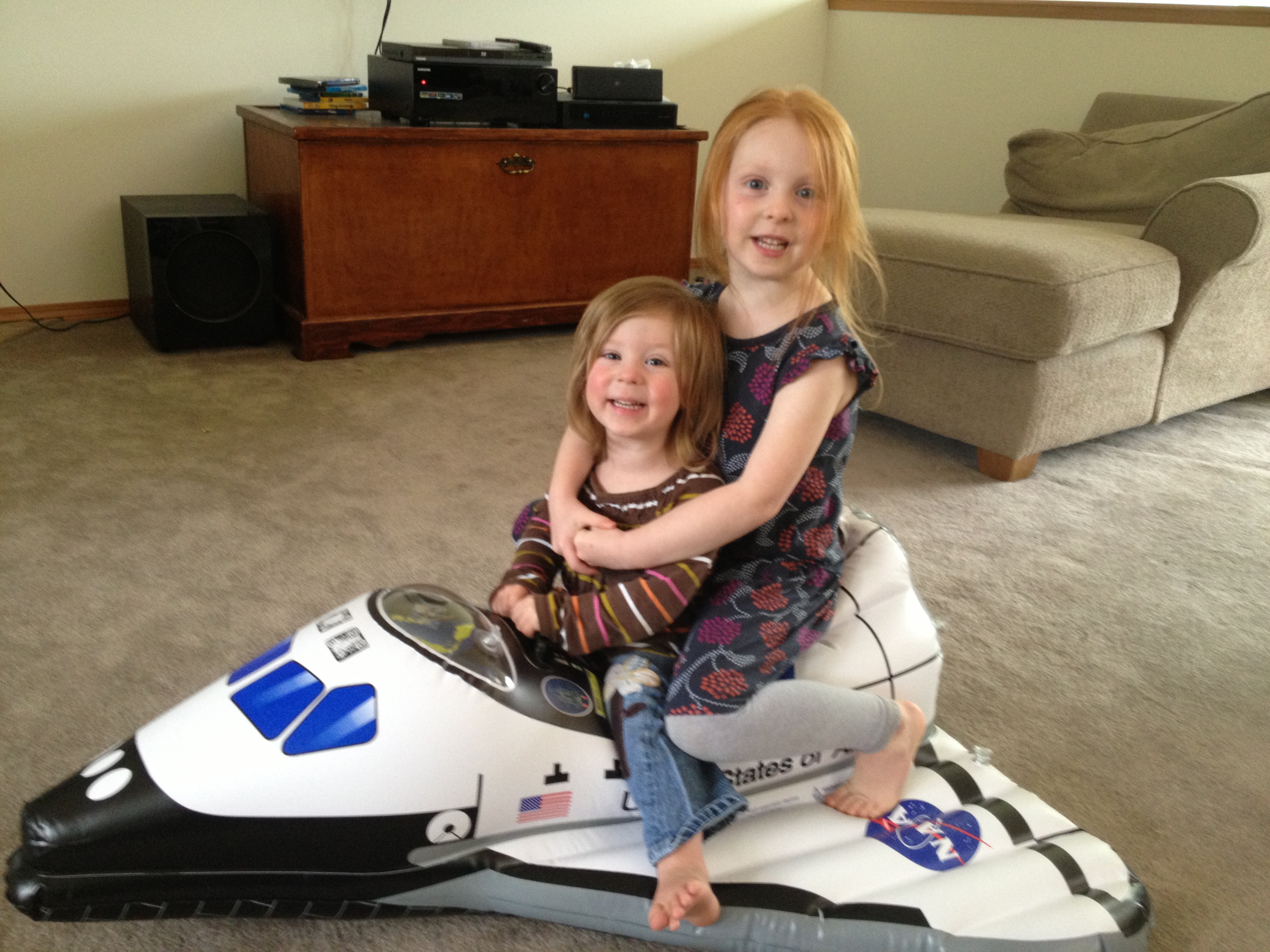 Yesterday was the last day of school but we’ve been lucky enough to have been blessed with lots of sunny days here in the Seattle area already this year! We’re looking forward to an awesome summer and my kids are especially looking forward to the WATER fun. Last year around this time we reviewed an Aeromax Astronaut Space Pack Sprayer. We had so much fun with it that when we were offered the chance to review another Aeromax item, we were thrilled! We chose the Jr. Space Explorer Inflatable Shuttle. We had to wait a few days after receiving it for the sun to come out so we enjoyed the toy indoors: