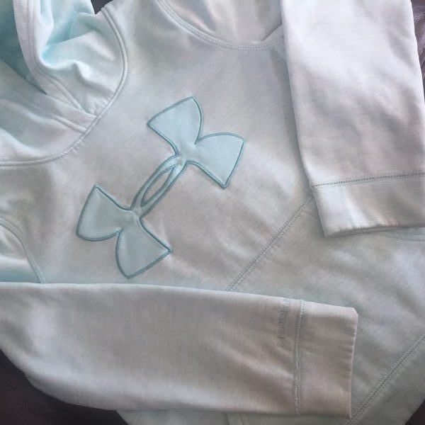 I almost threw this Under Armor sweatshirt away but my daughter bought it with her own money and claimed it was her favorite. These stains remained through several cycles of washing and drying and were throughly set in. I didn’t think it could be salvaged but I was wrong. I used the same method as the shorts and was surprised how much actually came out. BIZ isn’t magic but it did upgrade the sweatshirt from garbage to play-ware and made one little girl happy. Check out the results: