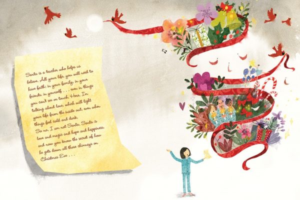 Her mom writes back, telling her that Santa is bigger than any one person. Part of the letter goes like this: “Santa is a teacher who helps us believe. All your life you will need to have faith: in your family, in your friends, in yourself…even in things you can’t see our touch. Here I’m talking about love, which will lift your life from the inside out and when things feel cold and dark. So no, I am not Santa. Santa is love and magic and hope and happiness and now you know the secret of how he gets down all those chimneys on Christmas Eve… He has help from the people whose heart’s he’s filled with joy. I am on his team and now you are too.”