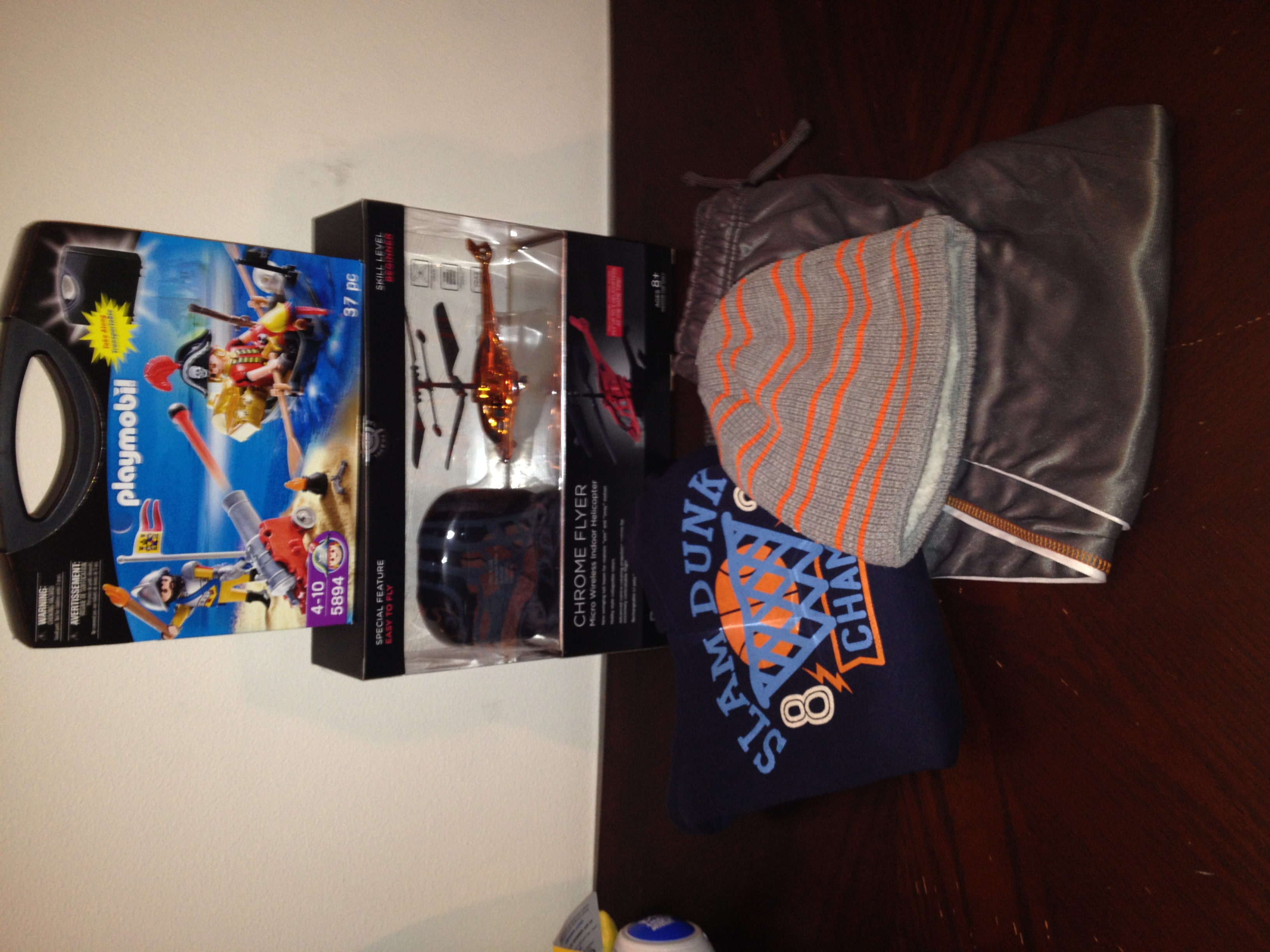 For the first grade boy we got a hooded sweatshirt, athletic pants, knit/fleece hat, a remote control helicopter, and a Playmobile pirate set. Not shown, a Spiderman card game in a tin.