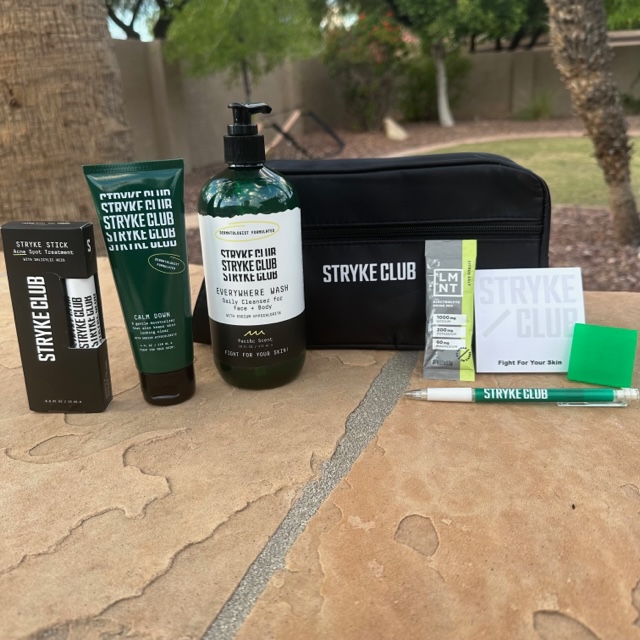My favorite product from this kit is the Calm Down moisturizer. I’ve used it myself and love the lightweight, fragrance-free moisturizer. My daughter has had good success with this and the Stryke Stick to clear up breakouts quickly without drying out her skin. You can get these products individually but the toiletries bag is really nice and the extra goodies are fun too!