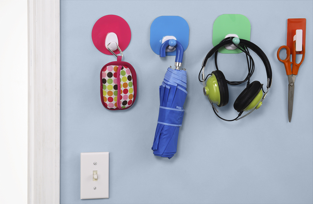 I love products that help me organize and keep the things I need at hand yet without clutter. UM Brands Stick UMs are a fun and convenient way to organize a wide variety of products. Available in lots of fun colors, Stick Ums are made from a revolutionary material that sticks to non-porous surfaces such as metal, glass, tile, and wood using nanosuction rather than messy adhesives, magnets or hardware. Just peel off the backing and stick! Stick Ums won’t heave any holes, marks or residue and they can be reused over and over again. Just wash them when they get dirty and they’re like new again!